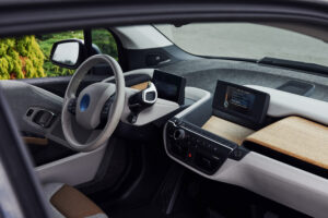 Inside of brand new modern electrical car. Particle view. Cropped photo.